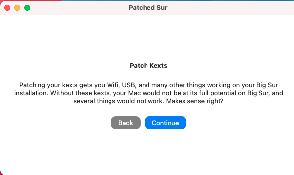 - 登录 Big Sur,发现问题 Wi-Fi无法使用,感觉是驱动没有安装,找文档,发现Big Sur 的安全模式更高,无法用优盘打开Big Sur硬盘,后来发现 Pathced Sur 有一个安装完成后的步骤,我没有运行,我运行后,发现有一个选项,就是Patch Kexts,可以安装Wi-Fi和USB Patch,于是运行,重启,发现Wi-Fi可以正常使用,目前一切正常